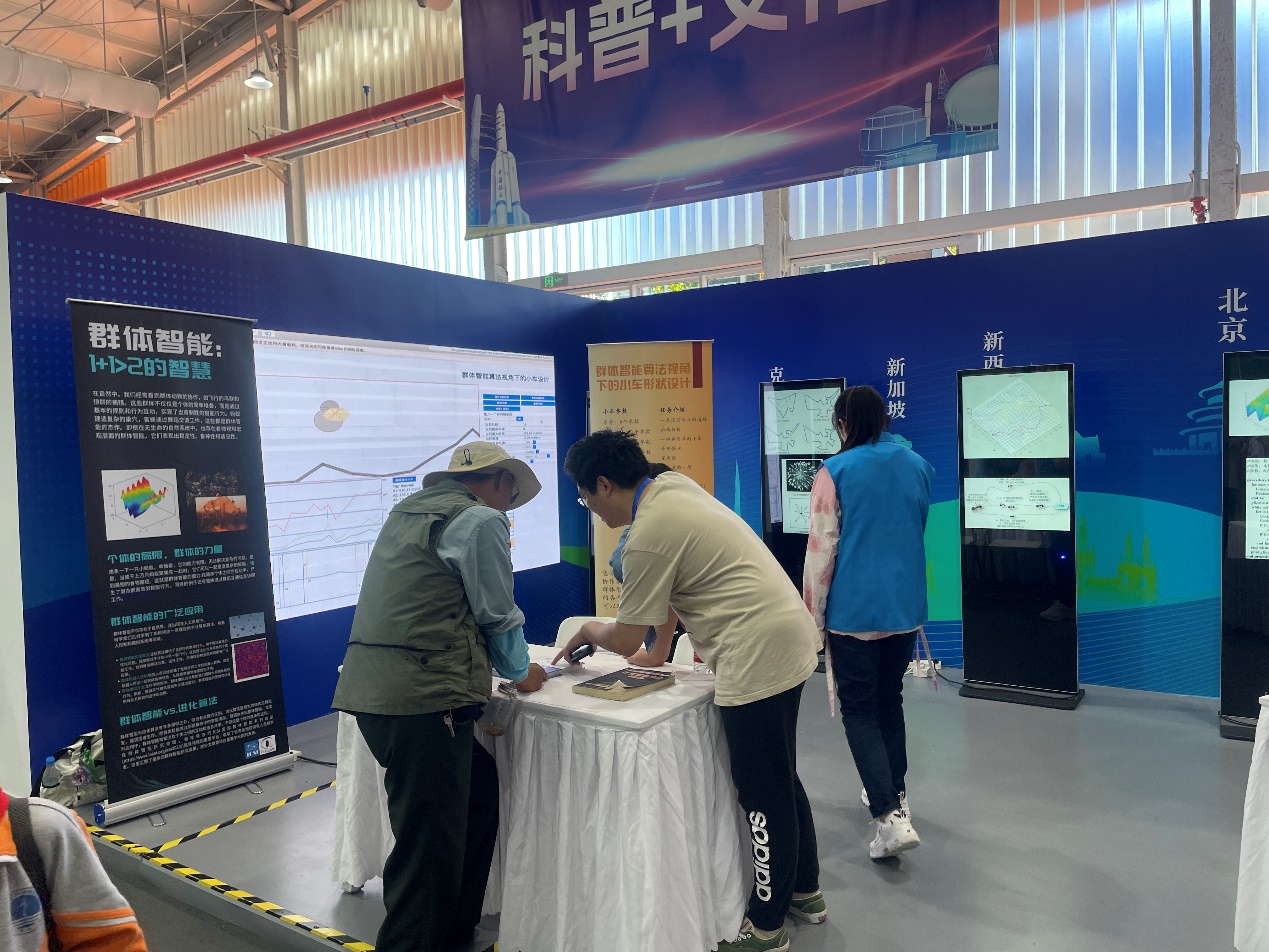 9月22日,2023年全国科普日主场活动在北京石景山首钢园举行。活动汇聚了来自全国104个单位的360个展项,全方位展示新时代以来我国在科技创新和科学普及方面取得的丰硕成果。2023年全国科普日活动的主题为“提升全民科学素质,助力科技自立自强”,旨在引导全社会更深入地参与科学技术普及,推动科技自立自强进程。作为本次科普日的亮点之一,北京大学智能学院计算智能实验室展示了人工智能中一个重要领域——群体智能算法。计算智能实验室的同学们准备了三个精彩项目,向参观者们展示了群体智能算法的创新应用,以可视化与交互的形式与现场观众进行互动。