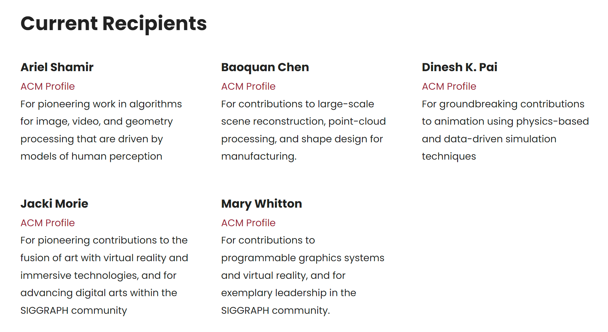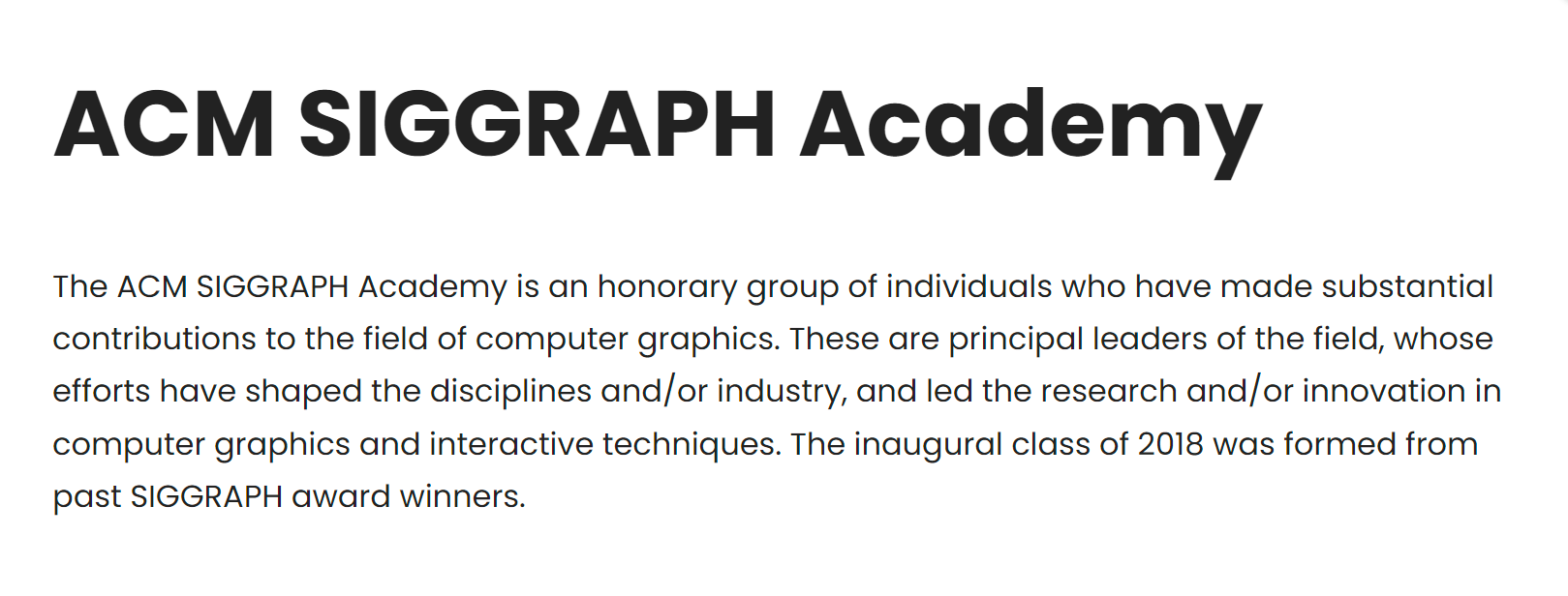 5月7日,该学院网站(https://www.siggraph.org/awards/acm-siggraph-academy)正式发布消息,宣布今年入选成员。