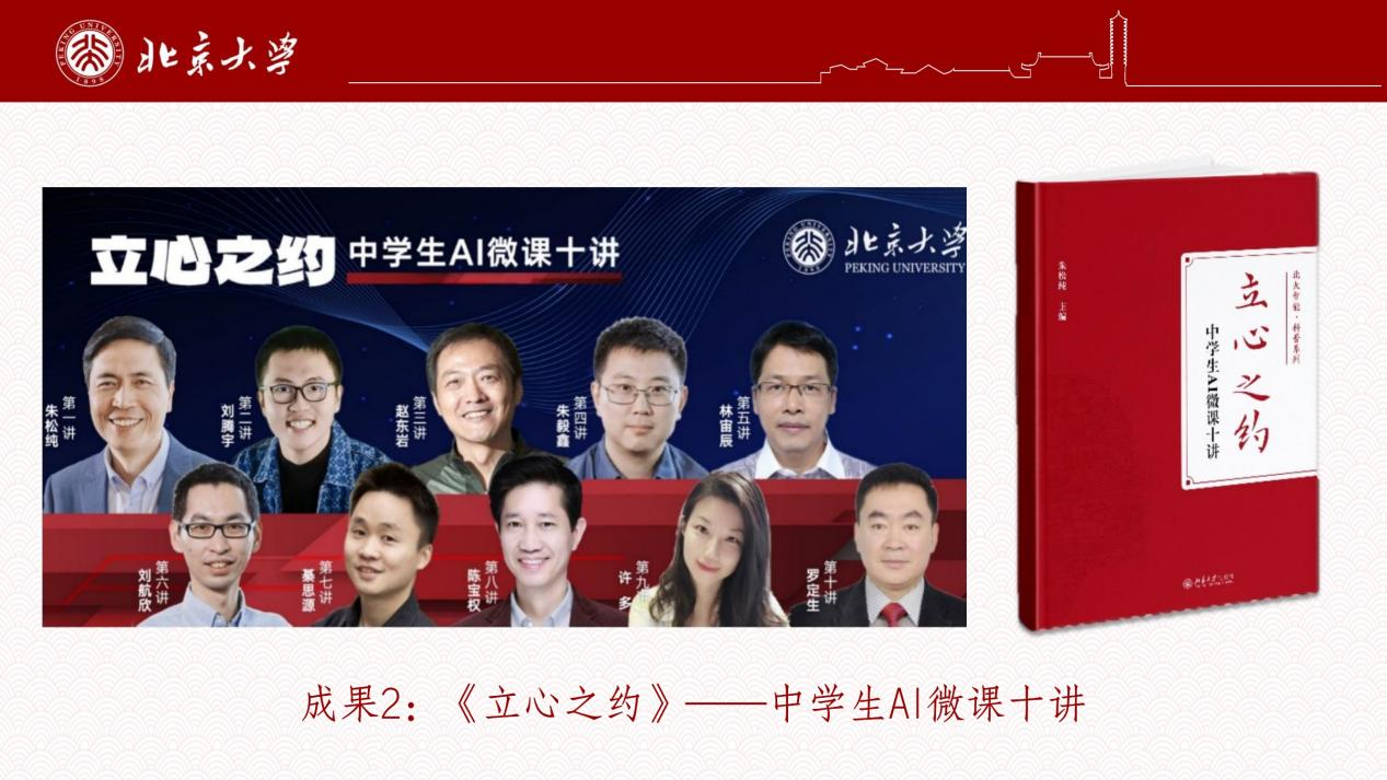 北大智能学院、北京通用人工智能研究院联合发布“《立心之约》微课十讲”,20余位专家组成教学团队,浓缩凝练北大人工智能本硕博课程体系30余门核心课程,推出全国首套面向中小学生的公开视频课程,面向中小学生发出“立心”邀约。课程自2023年首播即突破千万观看量,次年入选教育部“名师教AI”专栏。2025年,这门备受瞩目的视频课程以图书形式出版。
