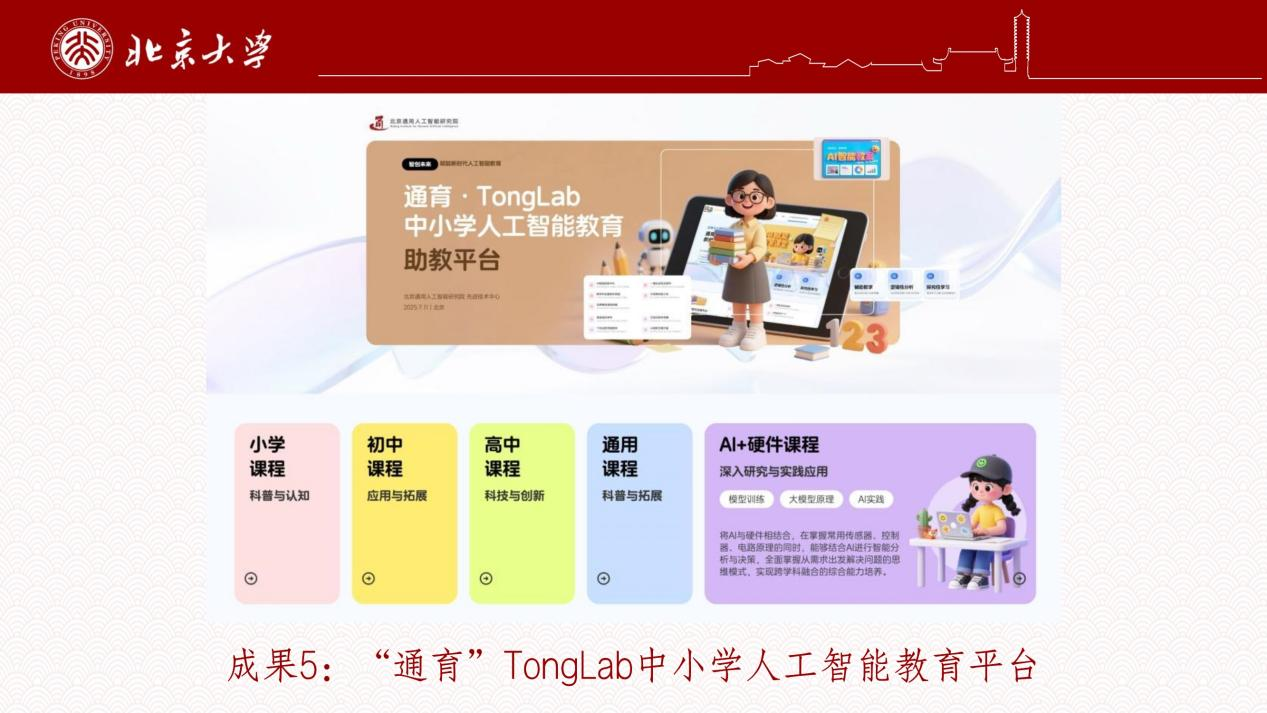 北京通用人工智能研究院与北大智能学院联合发布“通育”中小学人工智能教育平台,依据学生认知特点与课程要求,提供适配性强、科学性高的教学工具:小学阶段通过零门槛、游戏化体验激发兴趣;初中阶段以项目式学习培养工程思维;高中阶段提供体系化前沿课程引导创新实践。同时,强大的助教平台赋能教师,提供智能教案生成、AI出题、作文批改、数字人预习等工具,显著提升教学效率。