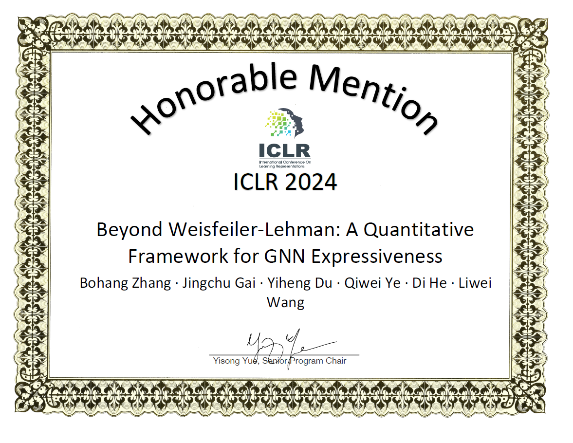 为鼓励人工智能和机器学习领域具有突出贡献和创新性的研究,2024年5月7日, 机器学习国际顶级会议ICLR官方公布了杰出论文奖(Outstanding Paper Award)。在所投稿的7262篇论文中,来自北京大学智能学院王立威、贺笛教授团队的科研成果“Beyond Weisfeiler-Lehman: A Quantitative Framework for GNN Expressiveness”经层层选拔最终荣获杰出论文奖提名,成为11篇荣获杰出论文奖提名的论文之一。该论文的共同第一作者是2019级智能学院博士研究生张博航与2021级数学学院本科生盖景初,指导老师为王立威教授和贺笛助理教授。