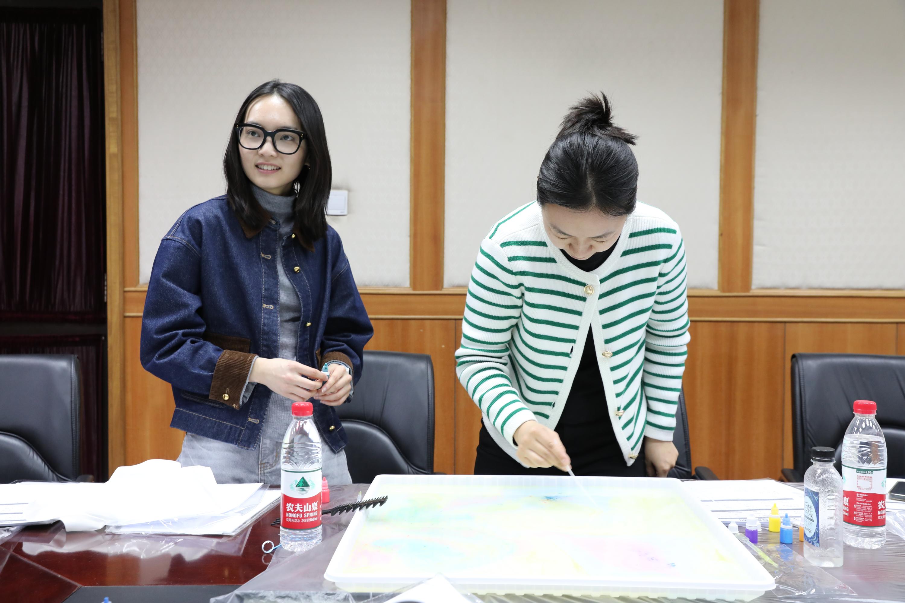 活动主持人现场讲解扎染技法。女教职工们两人一组,在扎染试剂中滴入青绿、绛紫、玫红、鹅黄等染料,用工具徐徐搅拌,等颜料变换出理想的图案,再合力提起丝巾四角放入试剂。随着丝巾缓缓展开,水墨般的晕染效果惊艳全场,每一幅作品都承载着创作者的巧思与期待。