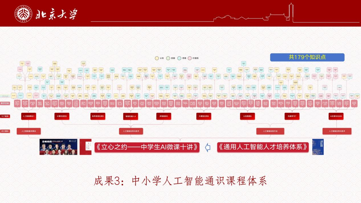 北大智能学院与北京大学附属中学、北京新府学学校联合打造“中小学人工智能通识课程体系”,以《立心之约》为根基源泉,对标教育部《指南》与北京市《地方课程纲要》,构建覆盖中小学全学段、全面培养“认知、技能、思维、价值观”四维素养的通识课程体系。该课程体系包含四大模块、九个知识板块,47个教学目标,179个知识点,通过逐级深化的内容编排实现中小学生AI知识、能力与素养螺旋式提升。