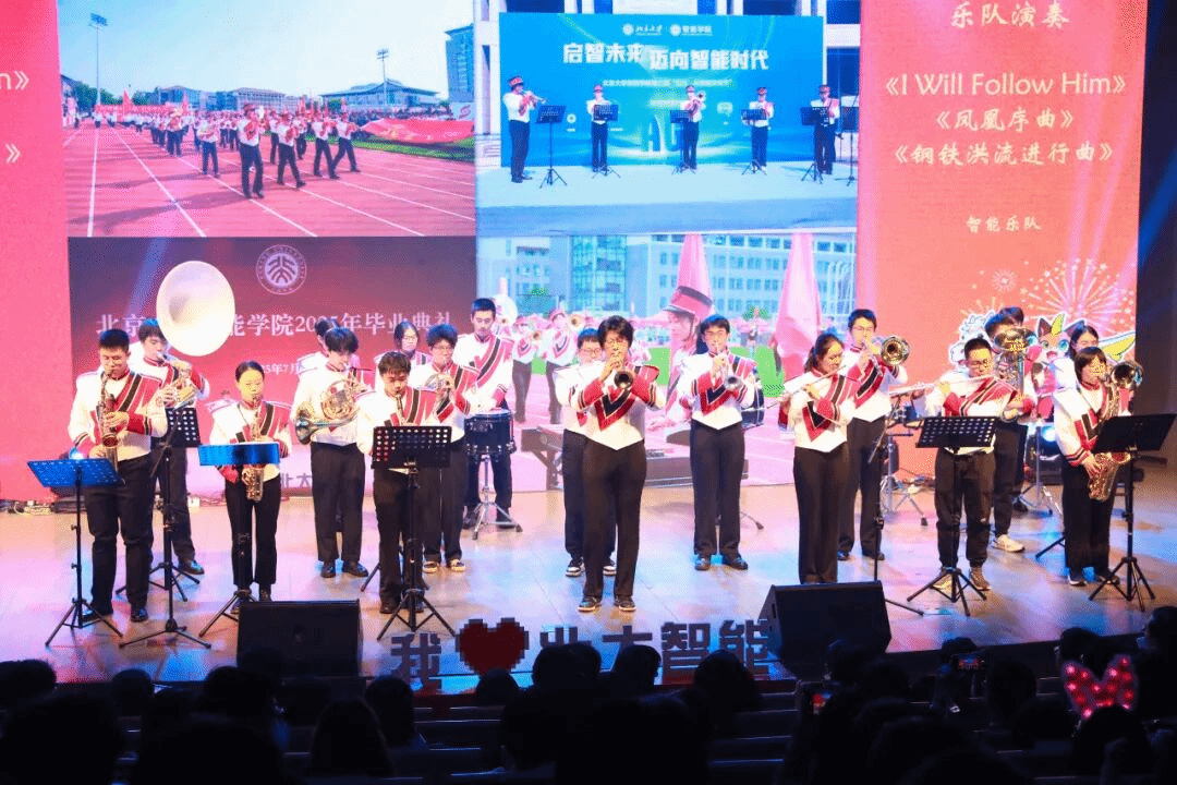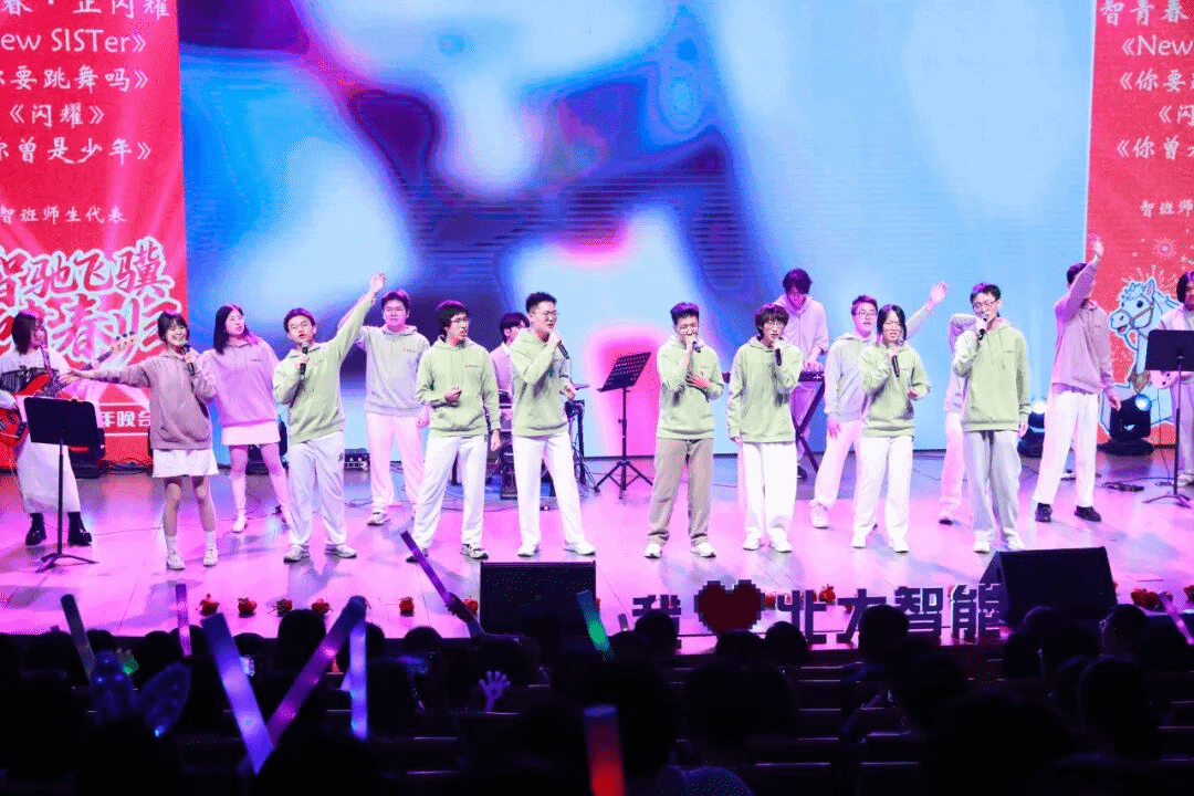 本次晚会主题为“智驰飞骥啸春归”,共分“青春赴新声”“初心映使命”“星途向远方”三个篇章。其中,智能乐队接连奏响《I will follow him》《凤凰序曲》与《钢铁洪流》三首乐章不仅激荡出科技与艺术融合的绚烂火花,更奏出北大智能人一往无前、锐不可当的精神风貌与时代担当。通班学生将《难忘今宵》演唱与“高雅人士”、《Macarena》舞蹈相结合,真情演绎智能科研人在实验室图书馆为梦想奋斗的日日夜夜。智班师生携手轨迹乐队,带来了歌曲串烧《致青春·正闪耀》连唱New SISTer》《你要跳舞吗》《闪耀》《你曾是少年》四首劲歌展现智班学子朝气蓬勃的风采