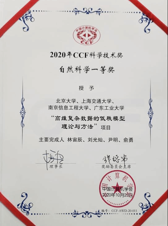 代表性论文谷歌学术引用近万次,被100余位中外院士和ACM、IEEE等主流学会Fellow积极评价,所提模型和算法被应用到100多个实际问题的建模和求解中,产生了巨大的国际影响。成果获评2020年度中国计算机学会科学技术奖自然科学一等奖(林宙辰排名第一)。