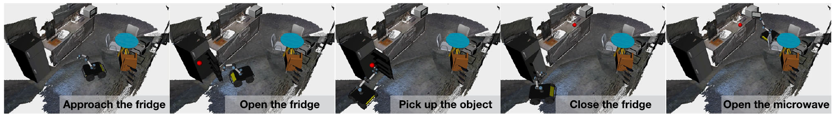 在重建得到的可交互虚拟场景里,借助场景图反映的运动链以及约束信息,机器人可以进行任务与动作规划[3,4],其仿真效果如图6所示。在最近的相关的工作[5]中,基于上文所述的场景图表征,机器人可以直接根据图编辑距离(graph editing distance)进行复杂的任务规划,并高效地生成动作。