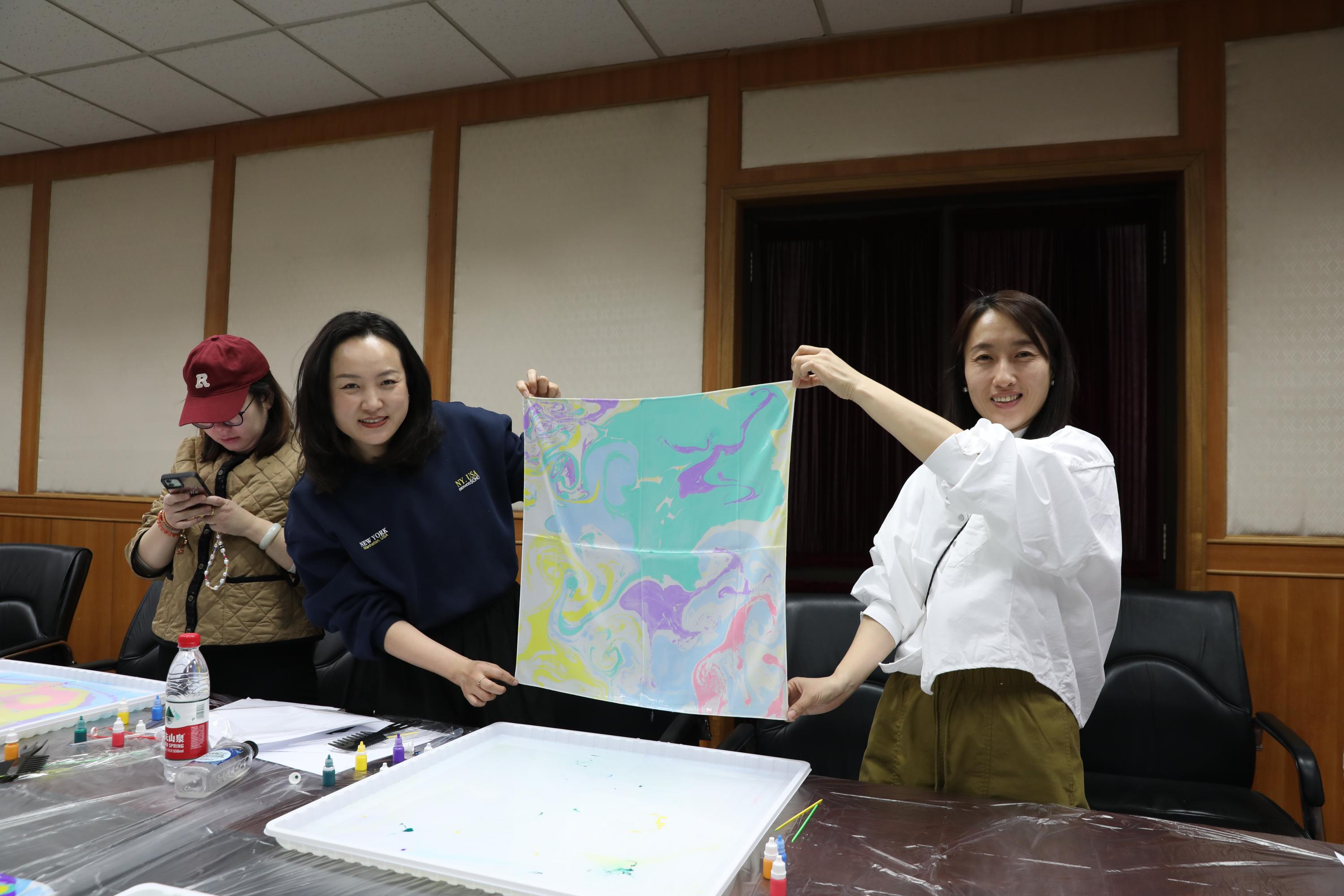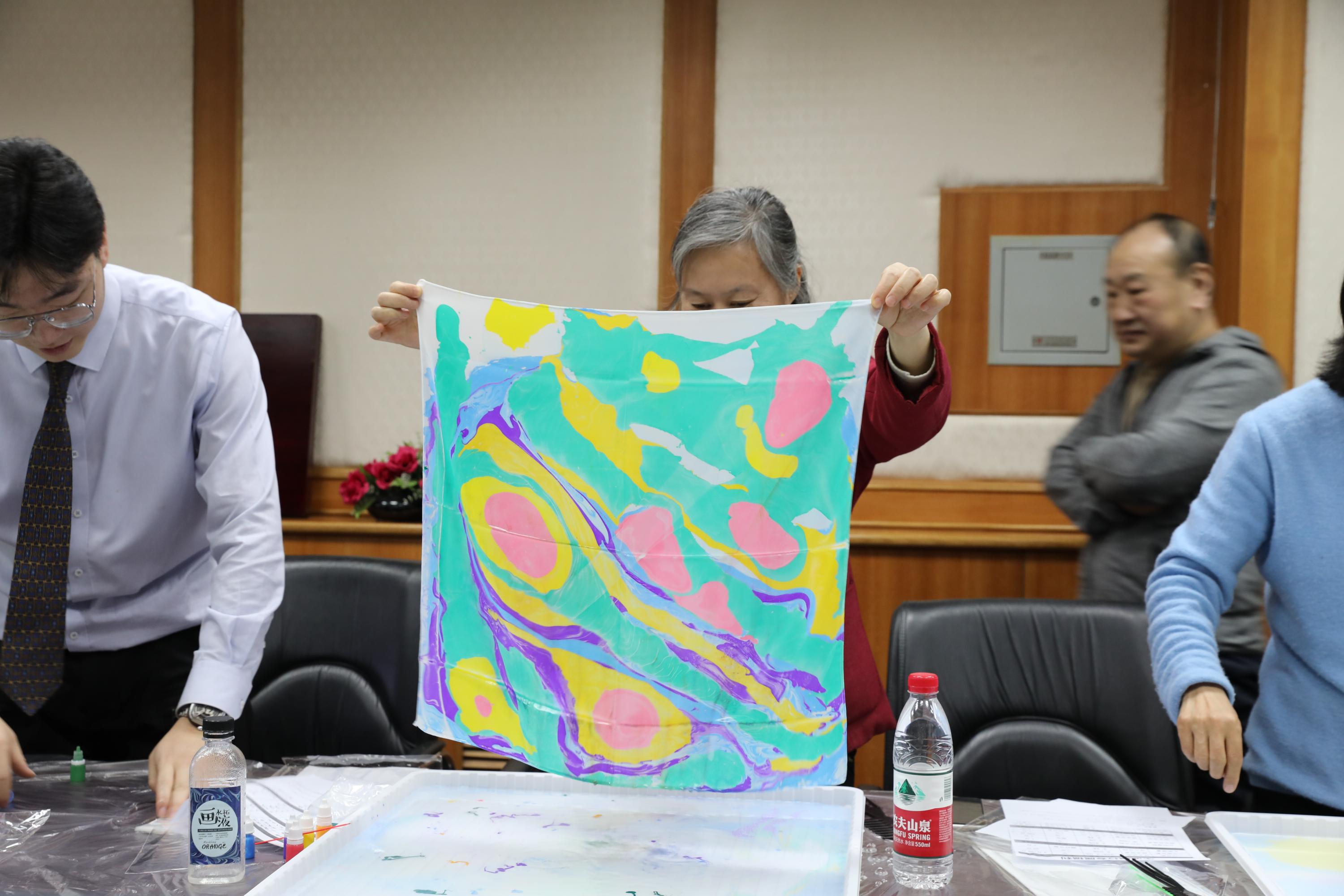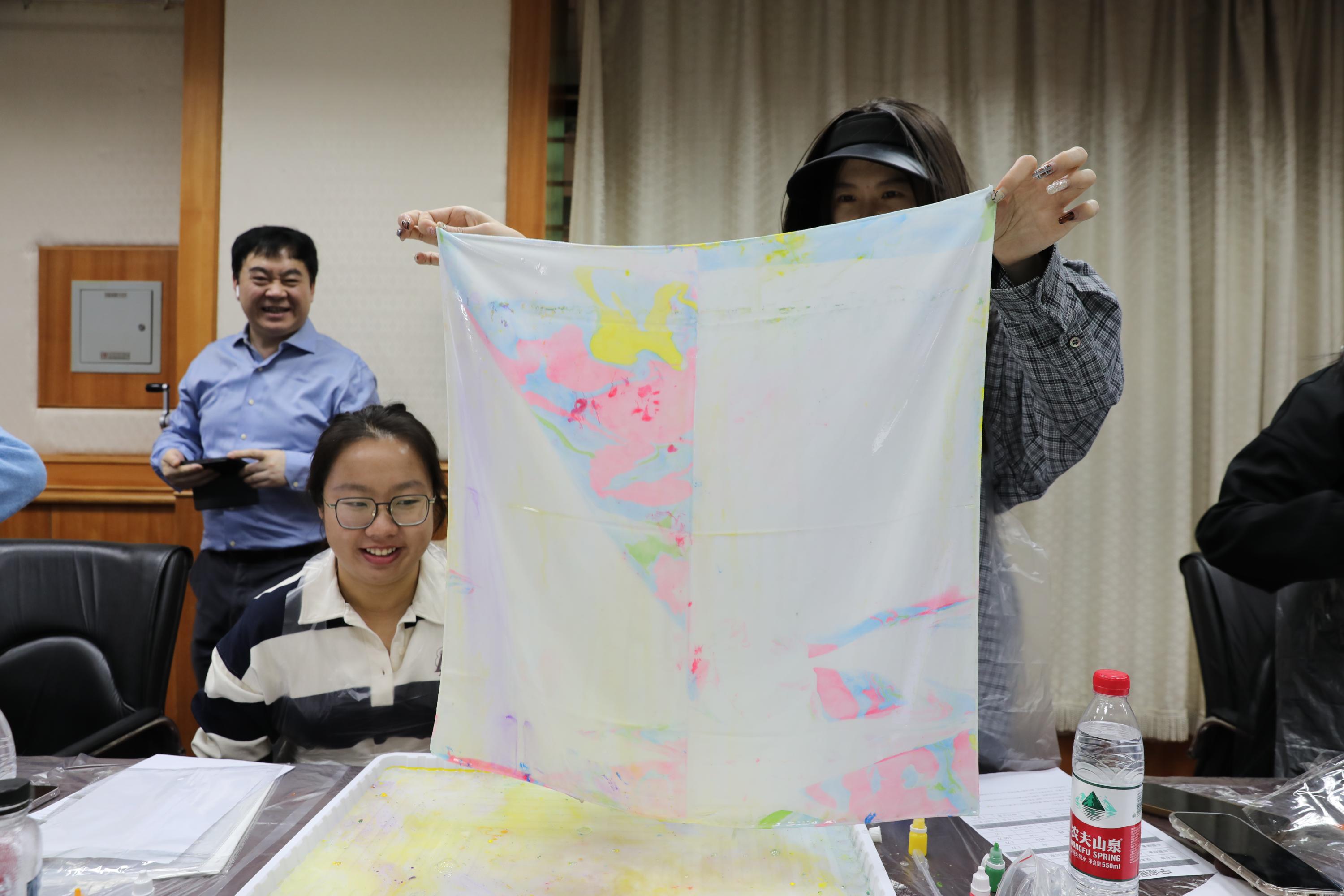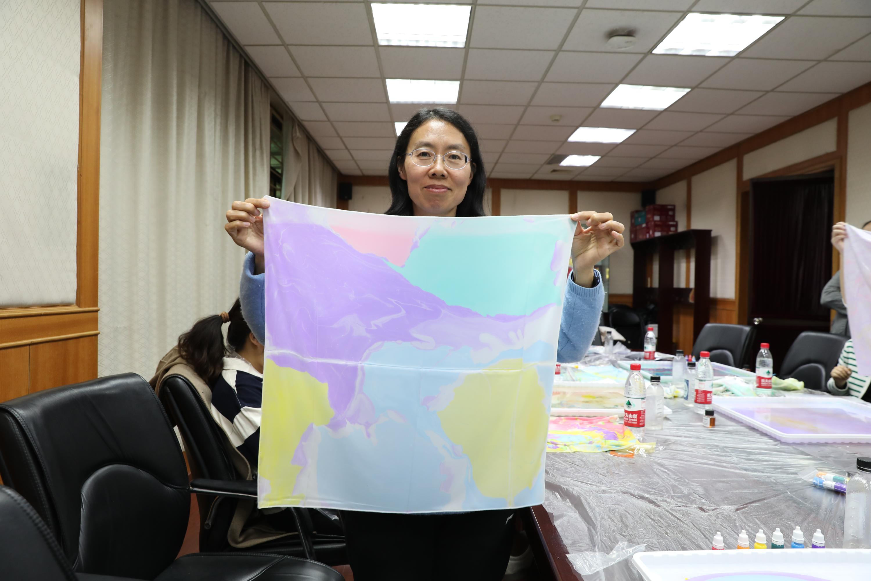 活动主持人现场讲解扎染技法。女教职工们两人一组,在扎染试剂中滴入青绿、绛紫、玫红、鹅黄等染料,用工具徐徐搅拌,等颜料变换出理想的图案,再合力提起丝巾四角放入试剂。随着丝巾缓缓展开,水墨般的晕染效果惊艳全场,每一幅作品都承载着创作者的巧思与期待。