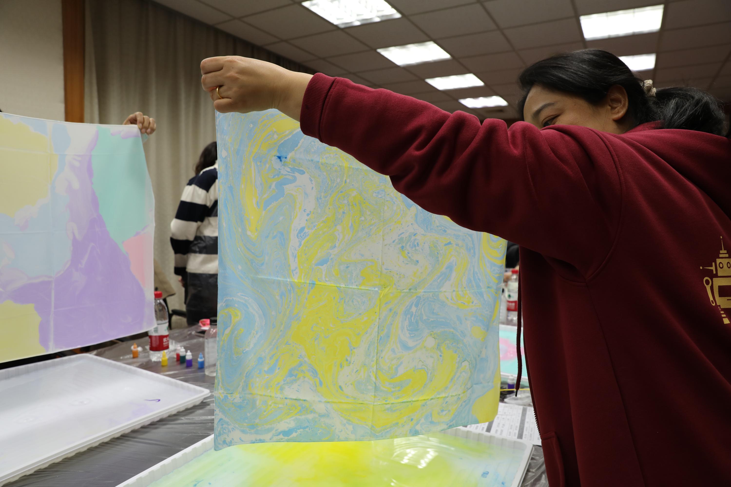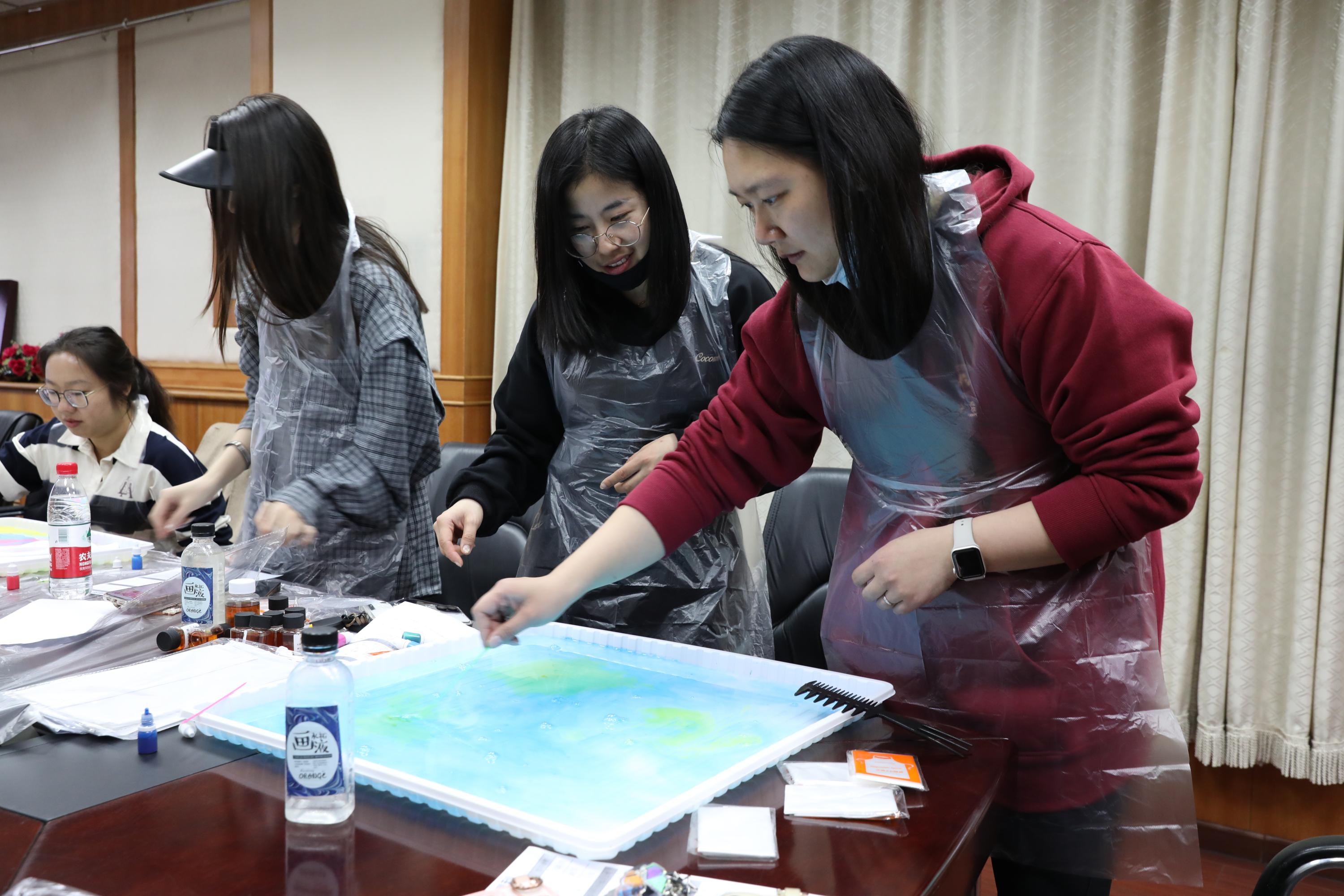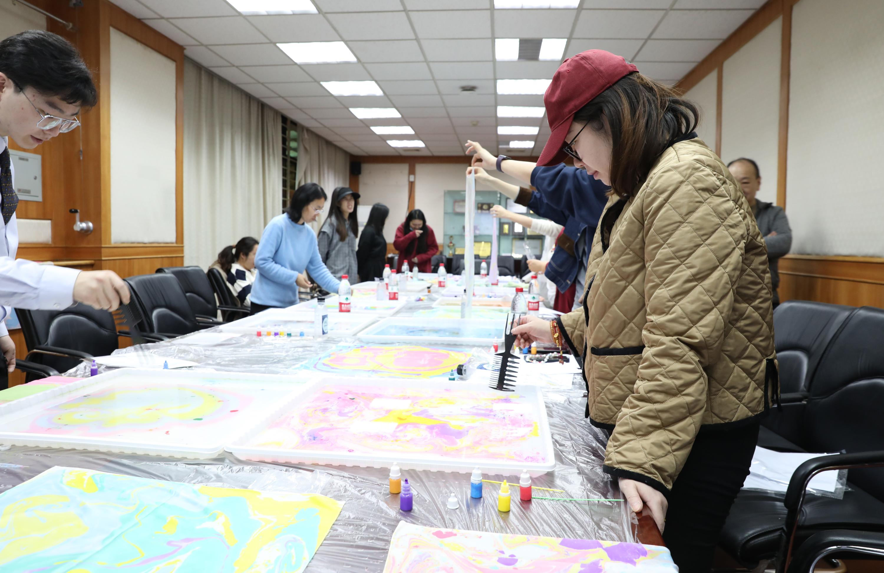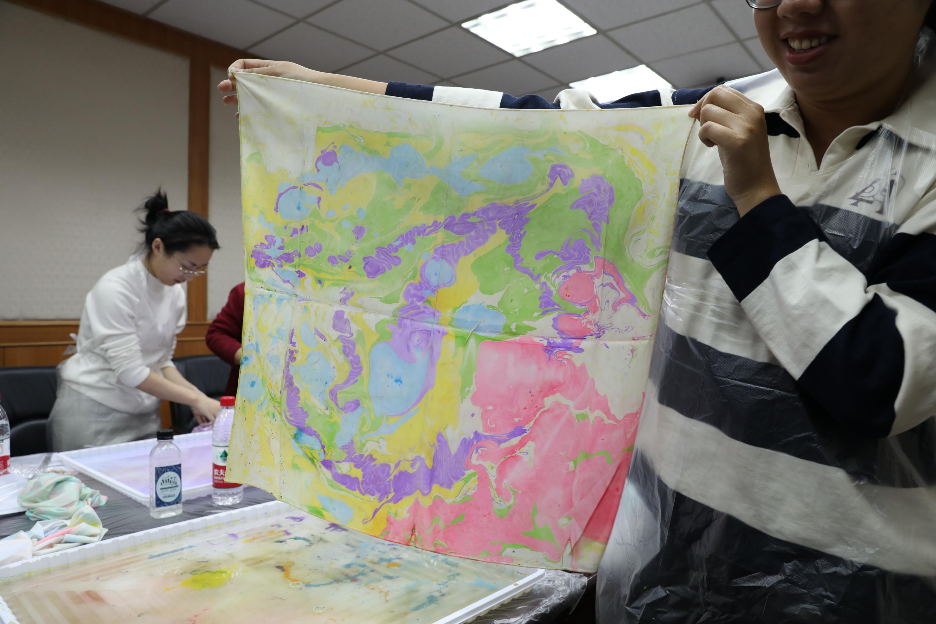 活动主持人现场讲解扎染技法。女教职工们两人一组,在扎染试剂中滴入青绿、绛紫、玫红、鹅黄等染料,用工具徐徐搅拌,等颜料变换出理想的图案,再合力提起丝巾四角放入试剂。随着丝巾缓缓展开,水墨般的晕染效果惊艳全场,每一幅作品都承载着创作者的巧思与期待。